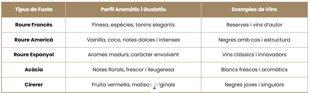 Cada tipus de fusta imprimeix una personalitat única al vi. Al nostre catàleg trobaràs vins criats en: