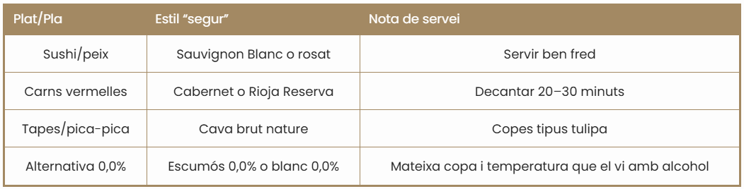 Un maridatge senzill ajuda que la conversa flueixi i deixa el vi en el seu paper: acompanyar el plat, no competir-hi.