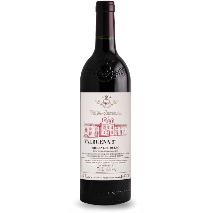 Valbuena, és l'expressió més pura de l'negre fi (ull de llebre) a Vega Sicília. L'acoblament de varietats que conformen aquest magnífic vi té al negre fi del raïm predominant de manera molt majoritària. L'altra varietat emprada és el Merlot, que participarà en major o menor mesura depenent de l'anyada. El ull de llebre de Valbuena s'obté de parcel·les situades en vessants còncaves de suau pendent que baixen de les costes de l'erm. Aquests sòls tenen el seu origen en material que es va anar erosionant i acumulant com coluvio en els vessants inferiors, desenvolupant un sòl d'alta expressió, amb una evolució important concretada amb la formació d'un horitzó càlcic en profunditat. Valbuena ens mostra una visió directa i comprensible de la grandesa d'aquest "terroir" amb la influència directa de cada anyada. La seva elaboració roman inalterable perquè siguin els factors climatològics de cada any els que marquin les diferències entre les diferents collites. Fermentació amb temperatura controlada en dipòsits d'acer inoxidable amb llevat autòctona. La fermentació malolàctica també la realitza en acer inoxidable. Després de la seva fermentació passa per una criança, entre fusta i ampolla, de cinc anys, d'aquí el nom de el vi Valbuena 5º. Fusta francesa i americana, bótes de 225 litres noves i usades, tines de 20.000 litres ... Un procés llarg i complex per a un gran vi.
