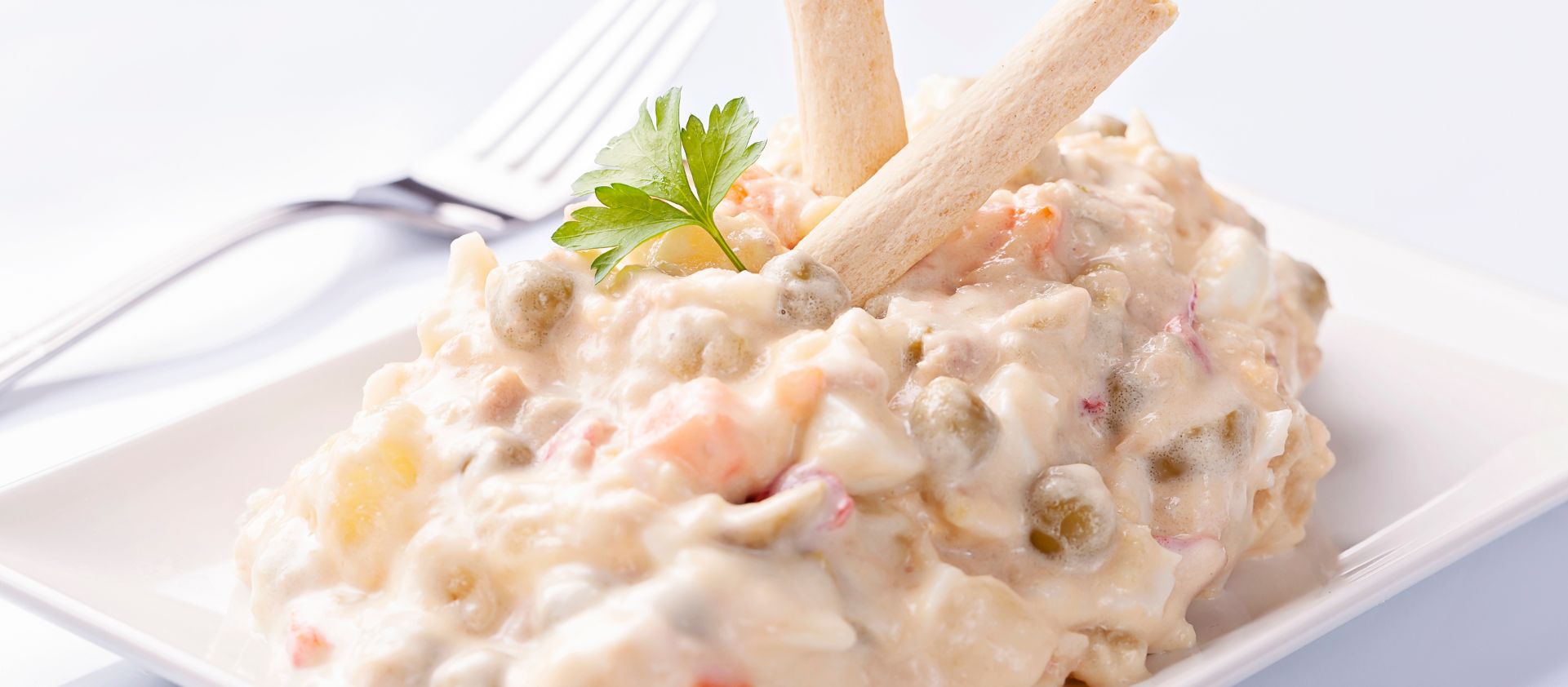 La reina de las tapas veraniegas: patata, zanahoria, guisantes, atún y mayonesa. Sencilla, pero irresistible.